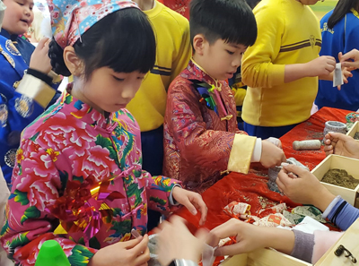 中文科聯同數學科、常識科和普通話科合作舉辦「中華文化日」,讓同學們透過攤位遊戲和科組活動,提高對中華文化的認識。不少家長義工和師生於當天均悉心打扮,讓校園更添歡樂的節日氣氛。 內容攤位十分豐富,同學們除了可製作麪粉公仔、傳統風車、傳統香包及傳統小食之外,同學們還可體驗射箭、高蹺及舞獅采聖旨等活動。透過多元化的活動,同學們能夠寓學習於娛樂,體驗中國傳統技藝之美。 至於中文科科組活動方面,同學可以透過猜字謎、用甲骨文寫出自己的生肖、寫福字掛飾及寫春聯掛飾等活動,學習博大精深的中華文化,實在是一件賞心樂事。 |
